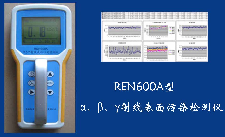 REN600A 表面沾污檢測儀REN600A型α、β、γ射線表面污染檢測儀即可檢測α、β、γ射線,也能檢測到X射線,它采用高速嵌入式微處器作為數(shù)據(jù)處理單元,點陣式大屏幕LCD液晶顯示,讀數(shù)清晰、操作方便,具有400條超大容量數(shù)據(jù)存儲。儀器采用進口的大面積MICA蓋革探測器,具有較高探測效率,可進行α、β輻射表面污染檢測和X、γ輻射劑量率的監(jiān)測。此外通過配套的RenriCont表面污染管理軟件可將存儲的數(shù)據(jù)讀出后分析?蓮V泛用在制藥廠、實驗室、發(fā)電廠、進出口商檢、采石場、環(huán)境實驗室、環(huán)境污染調(diào)查、核安全應急、緊急狀況營救站、金屬處理廠、地下油田、供油管道裝備、醫(yī)院核醫(yī)學科、同位素實驗室、環(huán)境保護和警察局等部門。REN600A型α、β、γ射線表面